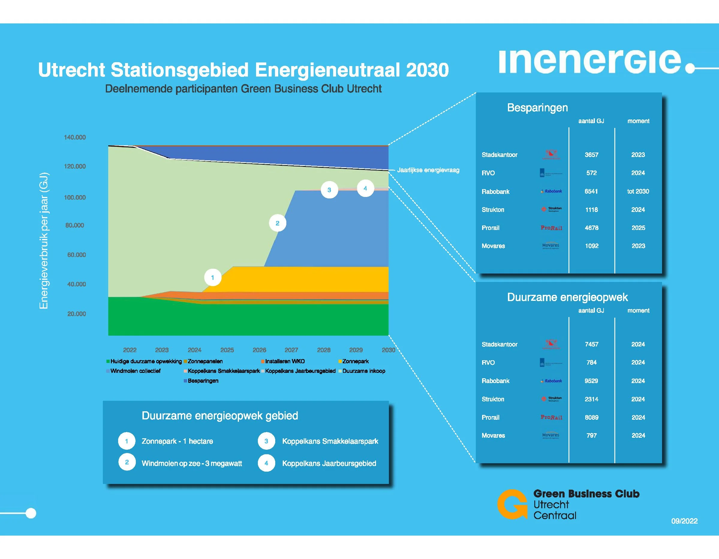 Jaarbeurs, Movares, ProRail, Rabobank, RVO en Strukton Worksphere zetten zich hiermee in voor een energieneutraal stationsgebied in 2030. Om hier invulling aan te geven, heeft InEnergie gewerkt aan een Routekaart met daarin adviezen over hoe als collectief de ambitie ‘Utrecht Centraal energieneutraal 2030’ vorm te geven.